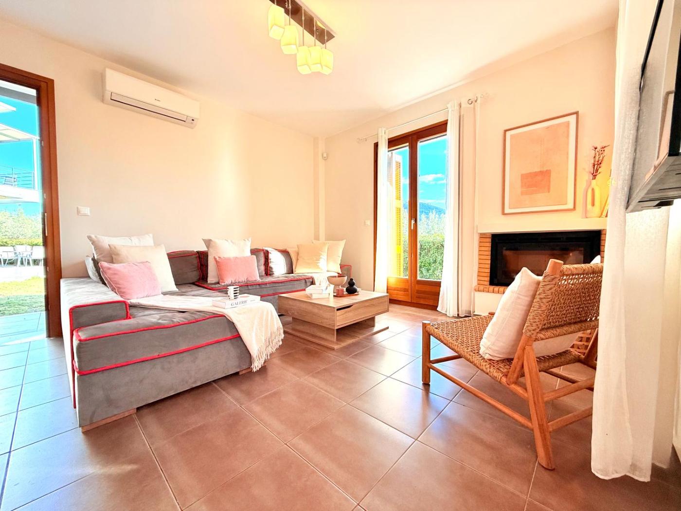 Villa. This villas special feature is the fireplace. Featuring a private entrance, this air-conditioned villa comprises 1 living room, 2 separate bedrooms and 2 bathrooms with a walk-in shower and a hairdryer. Guests will find a stovetop, a refrigerator, kitchenware and an oven in the well-fitted kitchen. The villa also provides guests with a barbecue. Boasting a terrace with sea views, this villa also provides a washing machine and a flat-screen TV. The unit offers 4 beds.