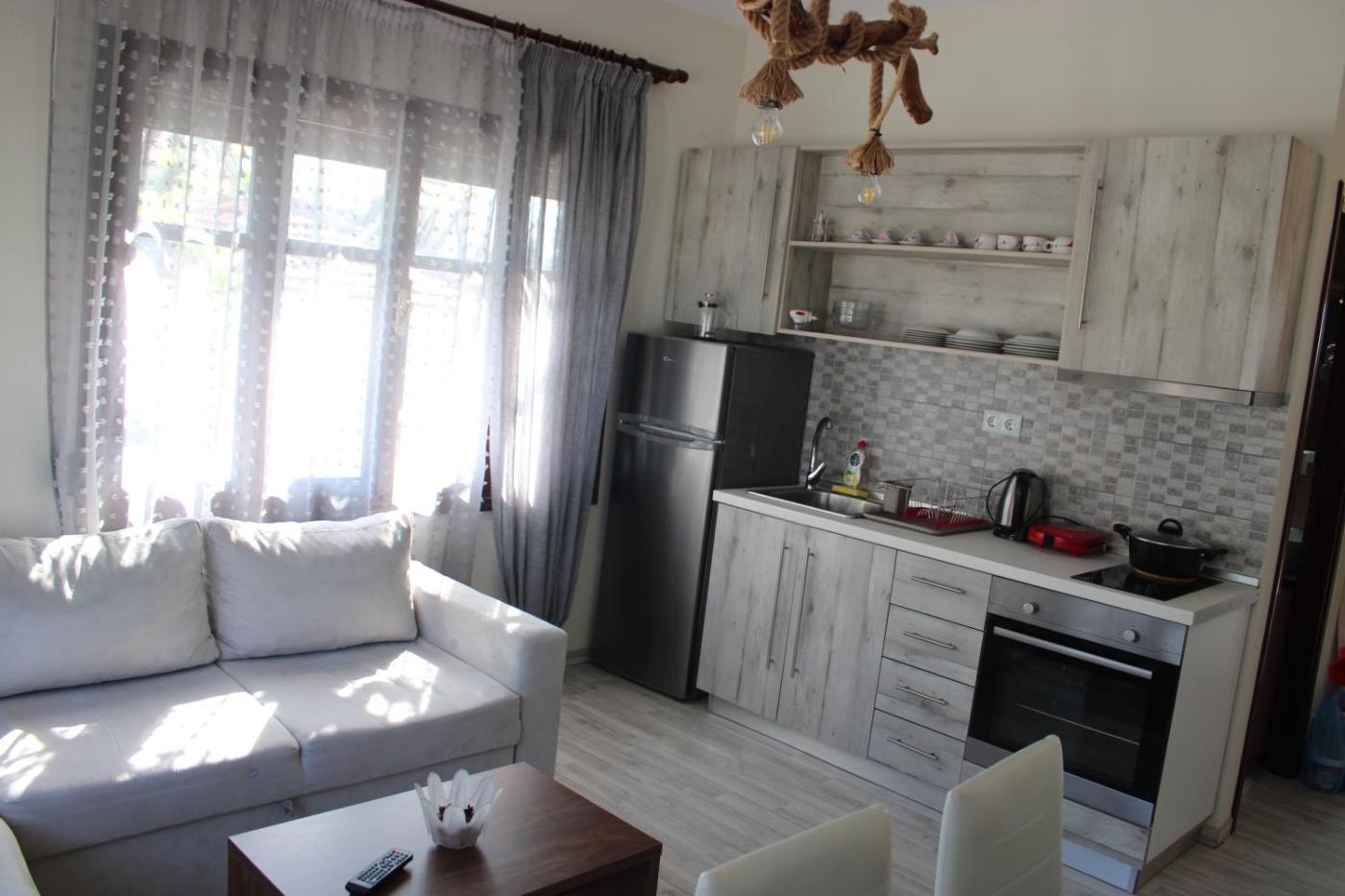 One-Bedroom Apartment. This air-conditioned apartment consists of 1 living room, 1 separate bedroom and 1 bathroom with a shower. In the kitchen, guests will find a stovetop, a refrigerator, kitchenware and an oven. The apartment provides a flat-screen TV with satellite channels, a tea and coffee maker, a dining area, a wardrobe as well as city views. The unit offers 2 beds.